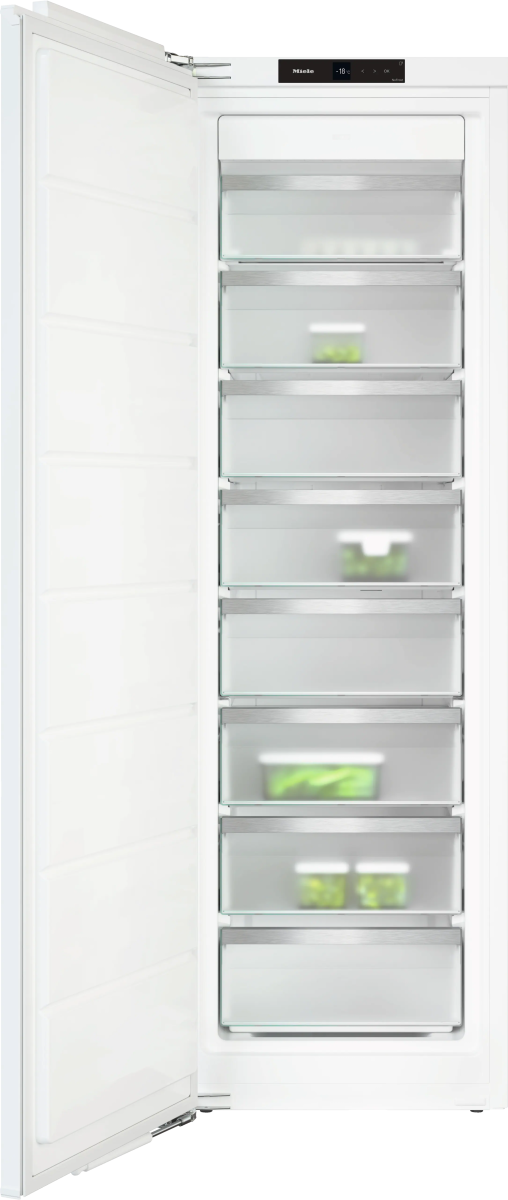 Встраиваемая морозильная камера с технологией NoFrost и восемью морозильными ящиками на телескопических направляющих для максимального комфорта.