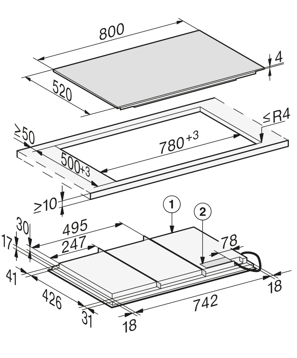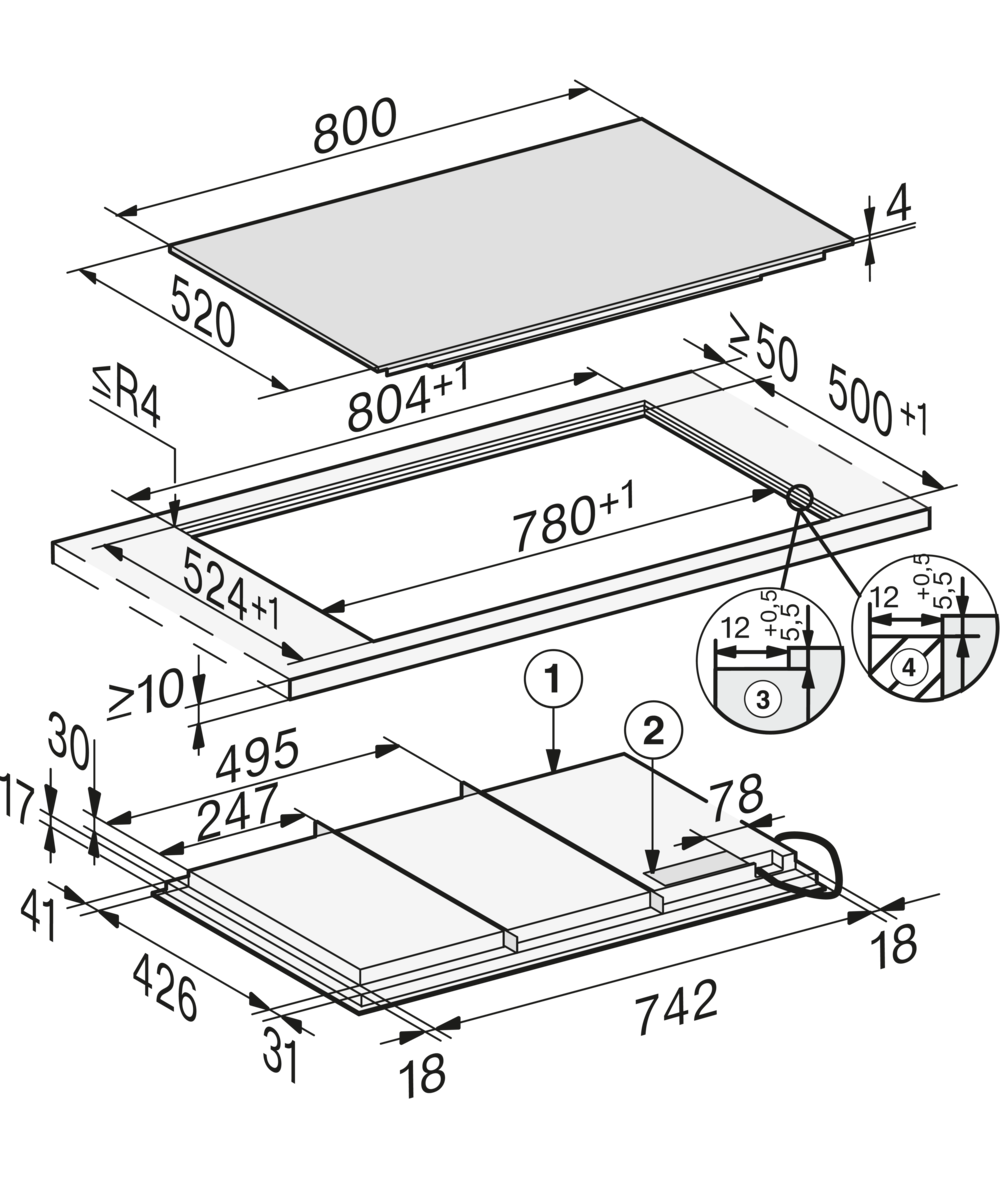 Размер ниши(Ш x Г): 780 х 500 (при монтаже сверху) или 780/804 x 500/524 (вырез ступенькой для монтажа заподлицо) мм